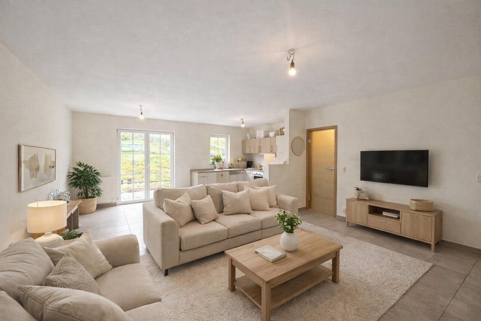 Séjour avec cuisine équipée (lave-vaisselle, four, plaque vitrocéramique, réfrigérateur et hotte)